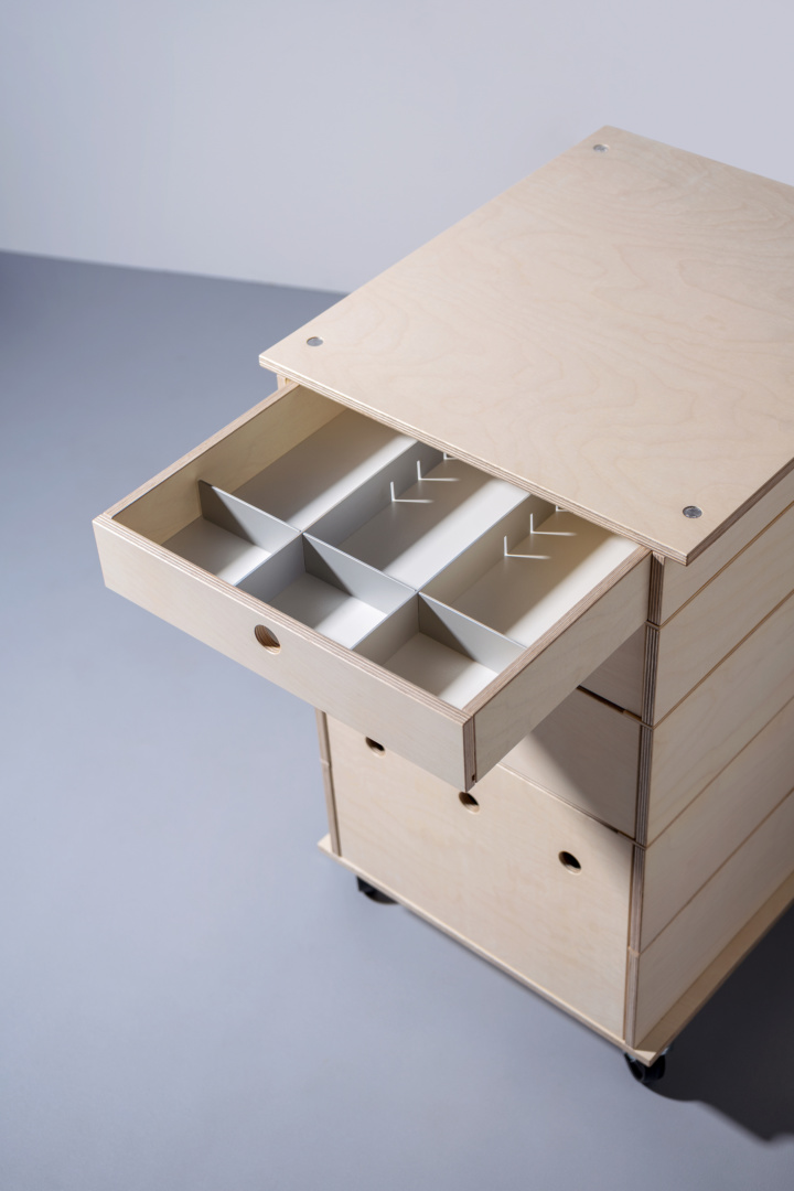 The modular system “Lader” designed exactly for your needs. The drawers are produced in four sizes so that they can be placed in any combination. Lader can be built perfectly for your daily needs. The drawers have two different fronts. The one front has a hole, the other has two extra holes for inserting numbered, written or symbolic labels. The Lader may have wheels or metal legs.